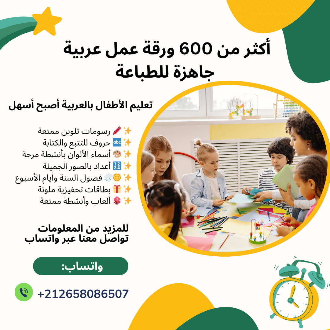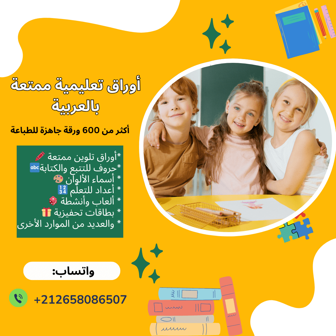 وفّر وقتك وجهدك، واحصل على مكتبة أنشطة تعليمية جاهزة للطباعة بالعربية. أكثر من 600 ورقة عمل تساعد طفلك أو تلاميذك على التعلم بمرح. اطلبها اليوم عبر WhatsApp وتمتع بمحتوى جاهز وسهل الاستخدام.